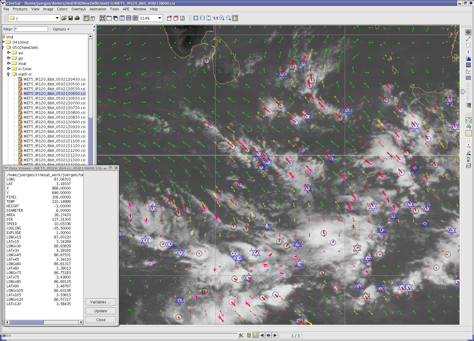 CineSat measures the movement of clouds from a series of satellite images and computes a short range forecast for the next few hours. It predicts and plots satellite images 3 hours ahead. Additionally, CineSat can move phenomena that have been detected, e.g. from observations or by the weather radar, along their expected path for the next few hours.