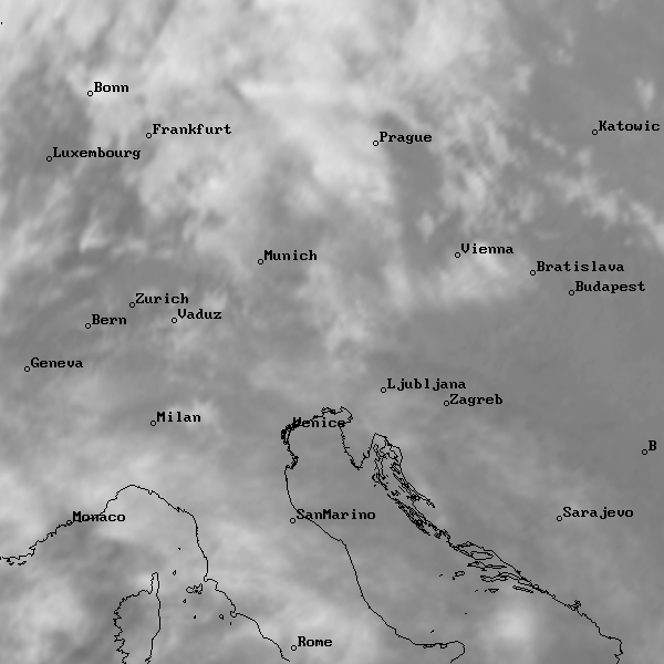 IR cloud image together with a land/sea background, geographical net and the major European cities drawn as overlay: